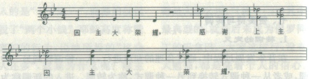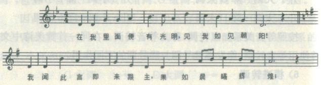 三是通过转调形式将几首中国传统曲调组合在一起加以连唱,用中国民族乐器加以连奏,比如将第51首《耶稣美名歌》(徽调式)、第83首《欢乐佳音歌》(宫调式)等中国圣诗连串在一起。